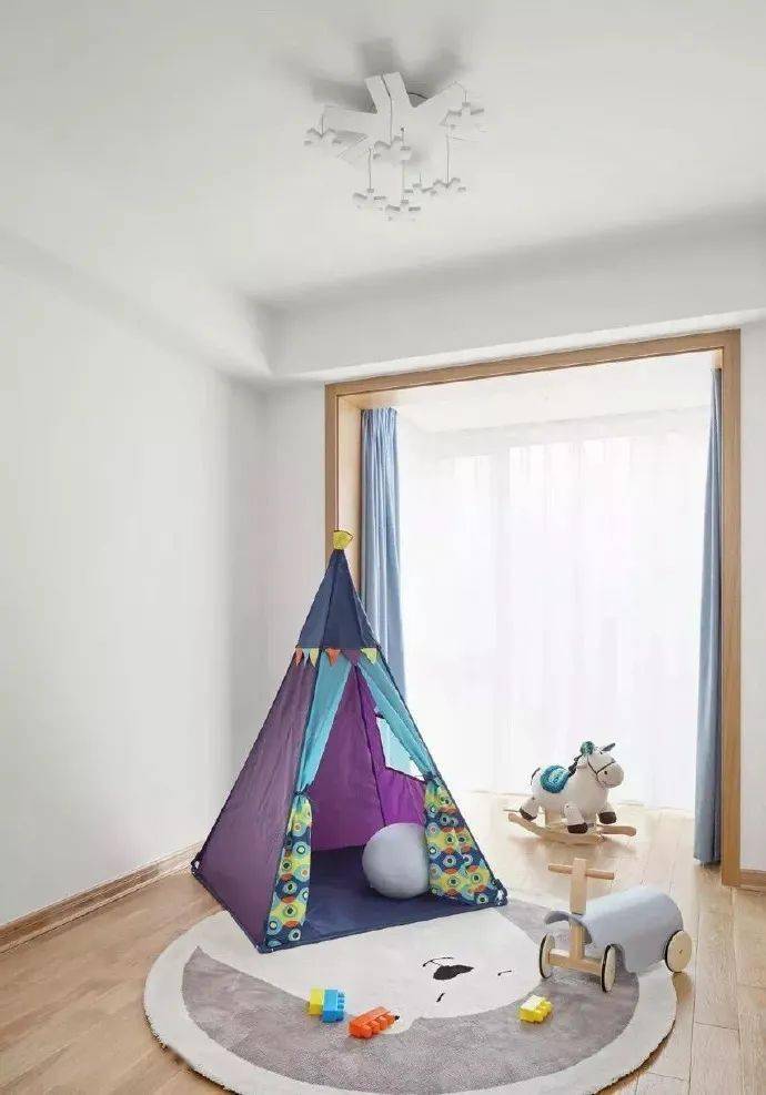 次臥作為兒童房使用,地上鋪了小熊地毯和各種玩具,還搭了一個小帳篷,供孩子玩耍,很有童真童趣,這里只拍了一部分,里面還添置了床、衣柜還有書桌,功能很齊全。