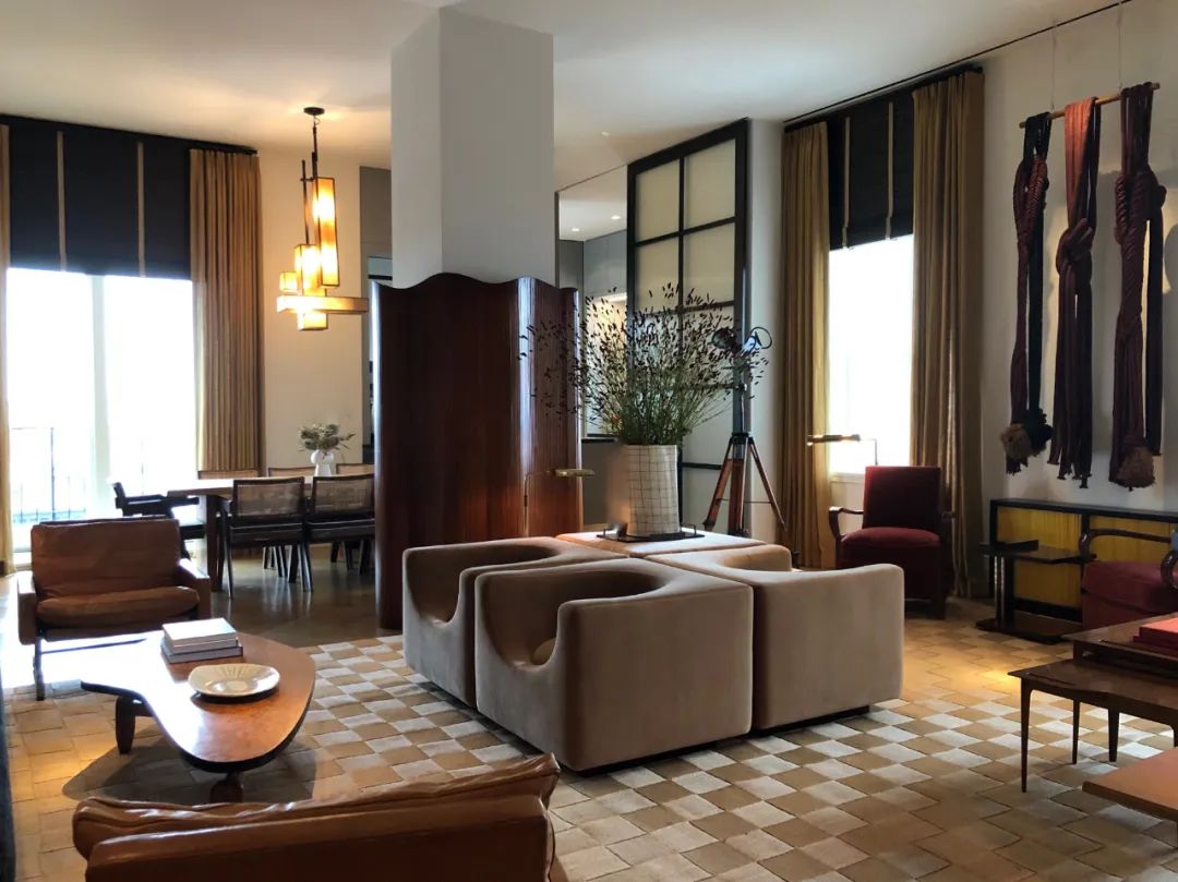 Baumann Fils 于 40 年代設(shè)計的松木屏風(fēng)在視覺上弱化了結(jié)構(gòu)柱的存在,格紋的地毯古典卻又不失時髦感。