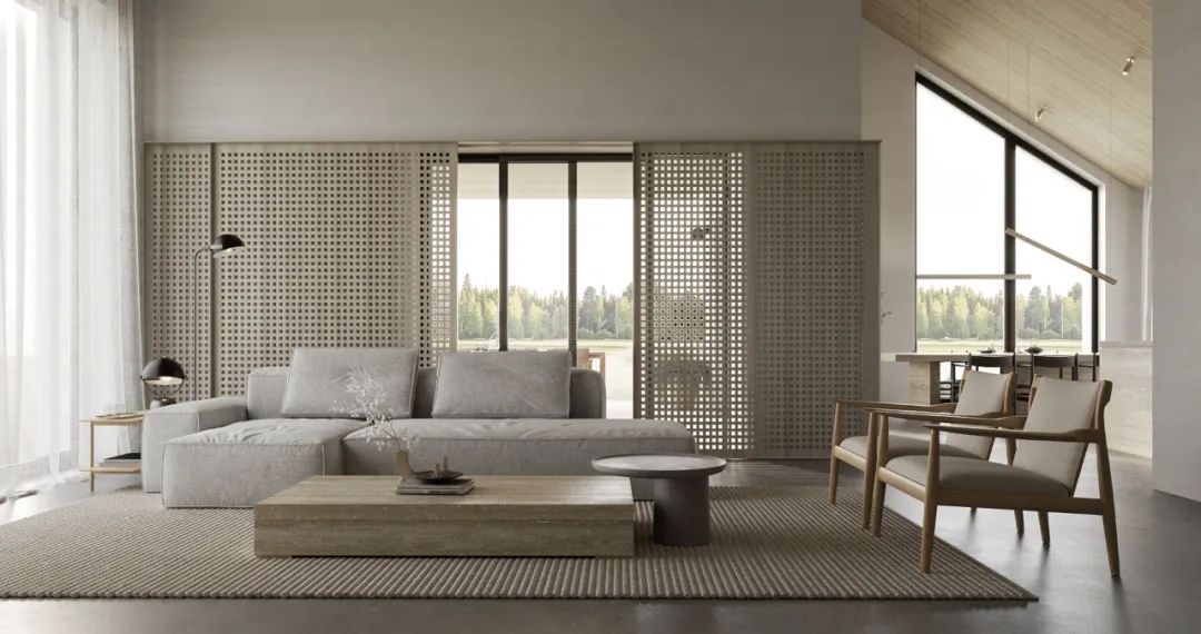 格柵是由一系列交錯(cuò)平行、規(guī)律排列的線條或板組成的結(jié)構(gòu),有方形,菱形等,可用于創(chuàng)造一個(gè)富有層次感的空間。它們可以在墻壁、天花板、家具等多個(gè)方面得到應(yīng)用。